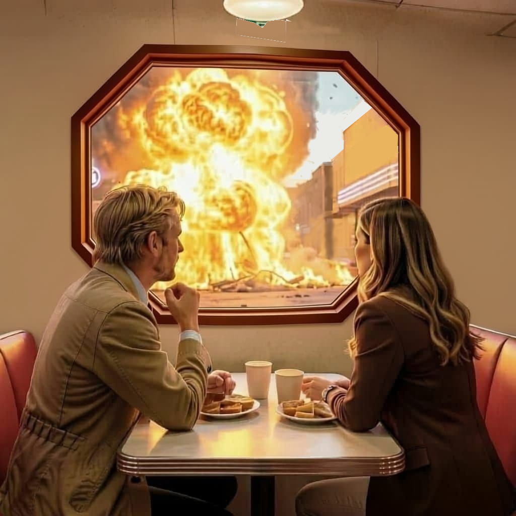 A thundering explosion not more than a hundred meters left of the diner made Paula, Zach and the other six people jump out of their chairs and rush to the diner’s street-facing wall of windows.
