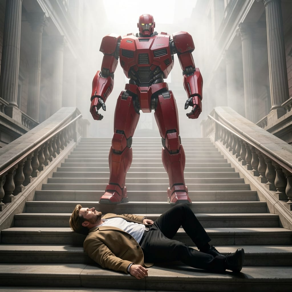 He spun around and caught a glimpse of a menacing blood-red android. He struggled to tear his arm away and opened his mouth to yell, but his effort was cut short by a silencing blow that sent his limp body to the floor. In his remaining seconds of consciousness, he thought he heard … he thought … he….