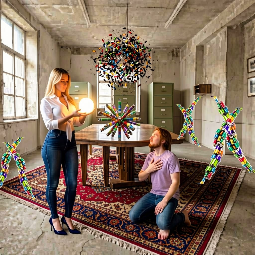 Legs aching, he stood up stiffly and stumbled into the shopfront to make coffee. A dull pain menaced the back of his neck and no wonder. He’d been up half the night, fitting the components together into … he didn’t know what. Now all the pieces were accounted for, except a glowing, oddball sphere that he’d never noticed before. By all appearance, it wasn’t designed to connect with the rest of the components. But once the majority of the components had snapped together, it began to blink. Over a period of twenty minutes or so, it emitted series of different phosphorescent colors, before settling into the same milky white glare that emanated from the tablet. From there, the shifting pattern colors would begin again with minor variations.